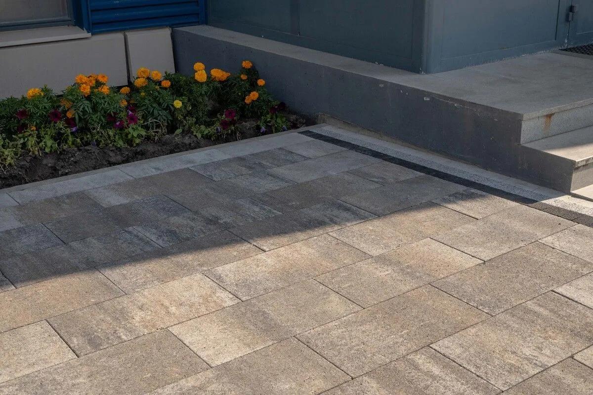 Изготавливается по уникальной технологии методом полусухого вибропрессования из бетона. Поверхность бело-горчично-черного цвета. Брусчатка Прямоугольник 600х300 отличается высокой износостойкостью и практичностью в эксплуатации.