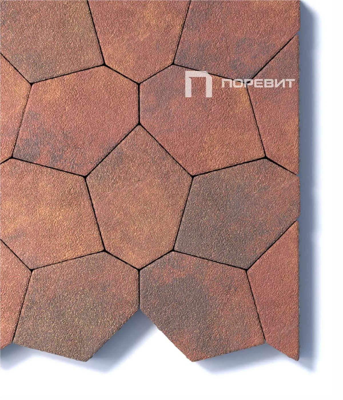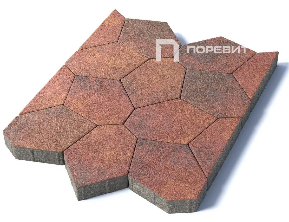 Изготавливается по уникальной технологии методом полусухого вибропрессования из бетона. Поверхность выполнена с оригинальной зернистой фактурой красно-коричнево-оранжевого цвета. Натуральная гранитная крошка в лицевом слое изделий наделяет плитку приятной шероховатостью, а также устойчивостью к скольжению.